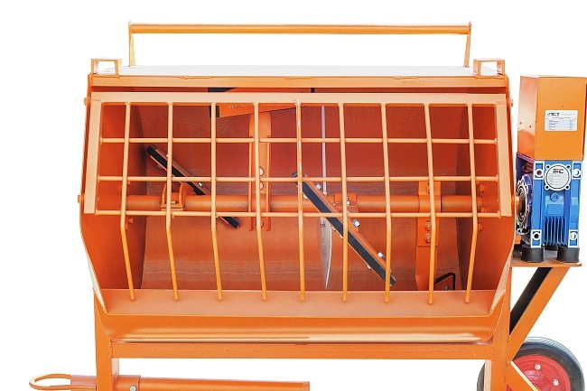 Принцип работы заключается в перемешивании компонентов с помощью 4-х резиновых лопастей, находящихся на горизонтальном валу, расположенном внутри барабана. При приготовлении строительных растворов, вначале в растворомешалку заливается вода, затем заполнитель, вяжущие смеси и пластификаторы. Время замеса, в зависимости от используемых материалов 105-120 с. После разгрузки готового раствора, сразу готов к новому циклу работы.