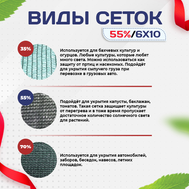 Сетка затеняющая, как и сетка фасадная, используется в качестве укрывного, защитного и теневого материала. Модель Сетка затеняющая фасадная 50% размером 6х10 метров имеет среднюю затеняющую функцию, которая оптимально подходит для укрытия растений и теплиц. Эта сетка для клубники, помидор и огурцов - самый лучший вариант по степени притенения. Благодаря нее растения получают достаточное количество света и тепла, но при этом не горят на солнце. Также сетка отлично подходит для создания теневых заборов, зон отдыха, навесов и скрытия территория от посторонних глаз (для большей непрозрачности материал можно сложить вдвое). Еще ее можно использовать при строительстве и ремонте, укрывая фасады зданий и строительные леса.