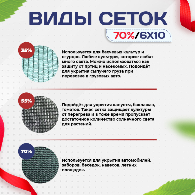 Сетка затеняющая, как и сетка фасадная, используется в качестве укрывного, защитного и теневого материала. Модель Сетка затеняющая фасадная 70% размером 6х10 метров имеет улучшенную затеняющую функцию, которая оптимально подходит для укрытия садовых и дачных участков, сельскохозяйственных полей. Но лучше всего ее использовать для создания теневых навесов, зон отдыха, временных заборов. Она не просто создает тень, но и обеспечивает незначительное снижение температуры в теневой зоне за счет пропуска всего 35% солнечных лучей.